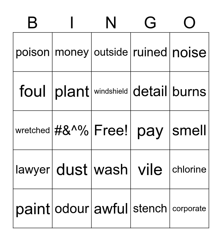 This bingo card has a free space and 24 words: dust, odour, windshield, paint, noise, poison, foul, money, pay, wash, detail, wretched, vile, chlorine, plant, stench, smell, outside, burns, #&^%, corporate, lawyer, ruined and awful.