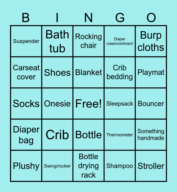 This bingo card has a free space and 63 words: Something blue, Something with panda, Something with Hmong design, Something handmade, Baby monitor, Bath toys, Bath tub, Bib, Blanket, Book, Bottle, Bottle warmer, Bouncer, Burp cloths, Carseat, Carseat cover, Onesie, Suspender, Bowtie, Crib bedding, Crib, Diaper bag, Diaper cream/ointment, High chair, Hooded towel, Humidifier, Jumper, Laundry detergent, Lotion, Mittens, Nursing pillow, Pacifier, Photo frame, Piggy bank, Playmat, Plushy, Receiving blankets, Shampoo, Body wash, Shoes, Socks, Sleepsack, Baby sling/carrier, Something personalized, Stroller, Swing/rocker, Teether, Thermometer, Washcloths, Wipe warmer, Hat, Bottle drying rack, Breast pump, Walker, Bassinet, Rocking chair, Nursery decor, Gift card, Baby gate, Crib mobile, Bottle brush, Rattle and Sippy cup.