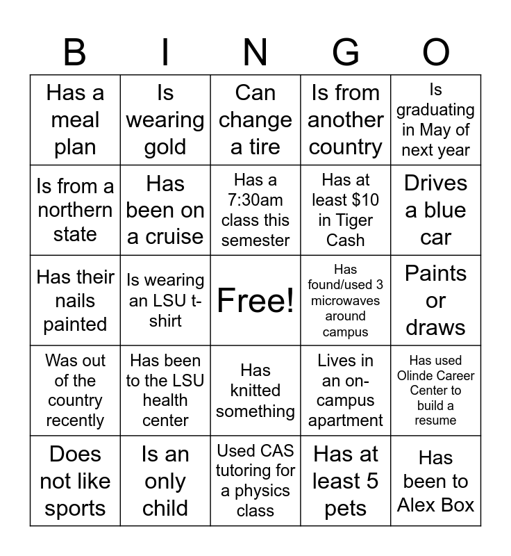This bingo card has a free space and 46 words: Has been to Tiger Stadium, Has been to Alex Box, Used CAS tutoring for a chemistry class, Used CAS tutoring for a physics class, Has been to the LSU health center, Is wearing purple, Is wearing gold, Has visited Mike the Tiger in the last week, Is from a northern state, Is from a western state, Has been on a cruise, Is from another country, Has used Olinde Career Center to build a resume, Lives in an on-campus apartment, Lives in an on-campus dorm, Lives off campus, Has a 7:30am class this semester, Has found/used 3 microwaves around campus, Is graduating in December of this year, Is graduating in May of next year, Is wearing an LSU t-shirt, Has at least 5 pets, Has a meal plan, Has at least $10 in Tiger Cash, Plays video games, Drives a blue car, Does not like sports, Drinks coffee twice a day, Has knitted something, Was out of the country recently, Plays a musical instrument, Was born the same month as you, Can drive stick shift, Is left-handed, Speaks two or more languages, Is an only child, Paints or draws, Plays the guitar, Is taller than you, Likes waking up early, Has been to Disney World, Can change a tire, Has their nails painted, Is wearing contact lenses, Had braces and Owns a Keurig.