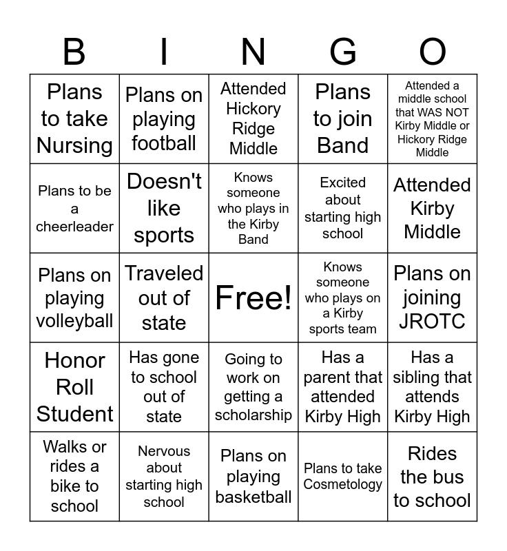 This bingo card has a free space and 24 words: Walks or rides a bike to school, Has gone to school out of state, Knows someone who plays in the Kirby Band, Plans to take Cosmetology, Attended a middle school that WAS NOT Kirby Middle or Hickory Ridge Middle, Plans to take Nursing, Plans on playing football, Attended Hickory Ridge Middle, Knows someone who plays on a Kirby sports team, Plans on joining JROTC, Plans on playing volleyball, Doesn't like sports, Has a parent that attended Kirby High, Has a sibling that attends Kirby High, Plans to be a cheerleader, Nervous about starting high school, Plans on playing basketball, Plans to join Band, Attended Kirby Middle, Honor Roll Student, Traveled out of state, Going to work on getting a scholarship, Excited about starting high school and Rides the bus to school.