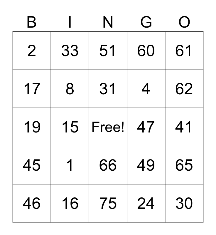 This bingo card has a free space and 24 words: 1, 16, 31, 46, 61, 2, 17, 33, 47, 66, 4, 19, 49, 65, 8, 24, 41, 51, 62, 15, 30, 45, 60 and 75.