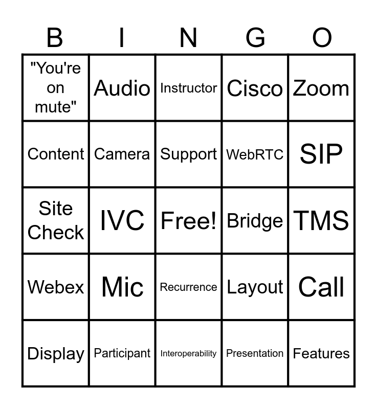 This bingo card has a free space and 39 words: MIVIDAS, Facilitator, Schedule, Camera, Display, Recurrence, Support, Codec, Zoom, Webex, IVC, Cisco, Features, TMS, Bridge, Mic, Soft Client, "You're on mute", Endpoint, Layout, Content, Interoperability, WebRTC, SIP, Originate, Receive, Sharing, Gatekeeper, Video, Audio, Point-to-Point, Connection, Instructor, Participant, Presentation, Student, Call, Site Check and Touch Panel.