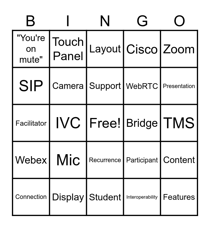 This bingo card has a free space and 40 words: MIVIDAS, Facilitator, Schedule, Camera, Display, Recurrence, Support, Codec, Zoom, Webex, IVC, Cisco, Features, TMS, Bridge, Mic, Soft Client, "You're on mute", Endpoint, Layout, Content, Interoperability, WebRTC, SIP, Originate, Receive, Sharing, Gatekeeper, Video, Audio, Point-to-Point, Connection, Instructor, Participant, Presentation, Student, Call, Site Check, Touch Panel and PIN.