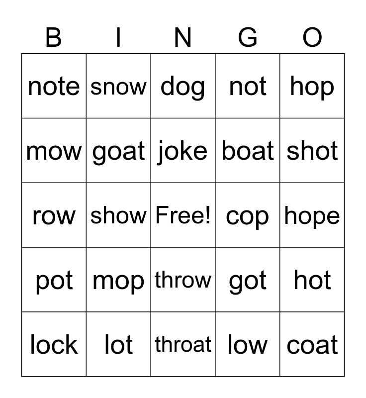 This bingo card has a free space and 33 words: choke, smoke, joke, broke, hope, note, goat, throat, boat, coat, mow, snow, low, slow, row, show, throw, got, hot, pot, lot, blow, not, shot, shop, mop, dog, cop, hop, lock, sock, top and fog.