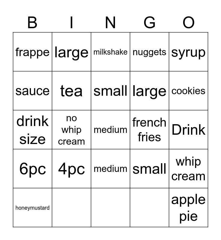 This bingo card has a free space and 21 words: french fries, small, large, medium, Drink, tea, frappe, milkshake, drink size, small, large, nuggets, 6pc, 4pc, sauce, honeymustard, apple pie, cookies, syrup, no whip cream and whip cream.