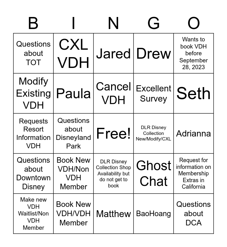 This bingo card has a free space and 24 words: Book New VDH/Non VDH Member, Book New VDH/VDH Member, Cancel VDH, Make new VDH Waitlist/Non VDH Member, Wants to book VDH before September 28, 2023, Questions about TOT, Modify Existing VDH, CXL VDH, DLR Disney Collection New/Modify/CXL, DLR Disney Collection Shop Availability but do not get to book, Excellent Survey, Requests Resort Information VDH, Ghost Chat, Request for information on Membership Extras in California, Paula, BaoHoang, Adrianna, Jared, Seth, Questions about Disneyland Park, Questions about DCA, Questions about Downtown Disney, Drew and Matthew.