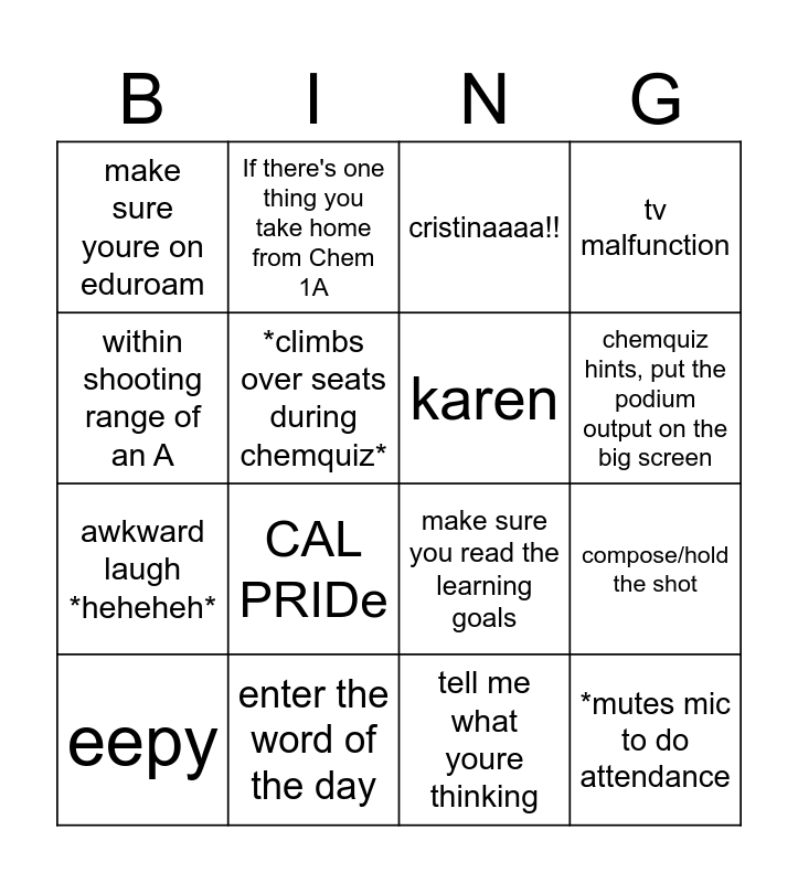 This bingo card has 16 words: enter the word of the day, compose/hold the shot, cristinaaaa!!, make sure youre on eduroam, awkward laugh *heheheh*, If there's one thing you take home from Chem 1A, make sure you read the learning goals, tell me what youre thinking, within shooting range of an A, *climbs over seats during chemquiz*, eepy, tv malfunction, CAL PRIDe, chemquiz hints, put the podium output on the big screen, karen and *mutes mic to do attendance.