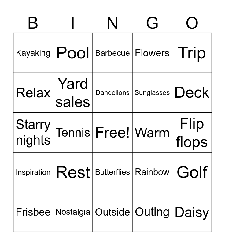 This bingo card has a free space and 239 words: Adventure, Amusement park, August, Activities, Ablaze, Abloom, Active, Air conditioner, Backyard, Breezy, Barefeet, Bees, Baseball, Beach, Books, Backpacking, Beach ball, Barbecue, Blistering, Bike, Berries, Bathing suit, Bikini, Blossoms, Butterflies, Blue skies, Boat, Bonfire, Cooler, Camp, Chipmunks, Cycling, Clear, Celebrations, Canoeing, Cookout, Cabin, Crickets, Camping, Cottage, Daisy, Diving, Deck, Drought, Dry, Drinks, Dehydrated, Denim, Daylight, Dandelions, Eventful, Ease, Eating, Explore, Energy, Energetic, Energize, Excitement, Endless, Fun, Flip flops, Free, Fresh, Fever, Float, Frisbee, Fishing, Family, Flowers, Fireflies, Fan, Fireworks, Fire, Foraging, Friends, Gardening, Grill, Green, Grass, Games, Grasshoppers, Golf, Hammock, Hike, Hat, Humid, Holidays, Hamburgers, Hot dogs, Heat, Hazy, Hay Fever, Hot, Ice cream, Ice-cold drinks, Ice tea, Inspiration, Jump rope, Jet ski, June, July, Kite, Kayaking, Ladybugs, Lake, Lawn, Lawn chair, Lazy, Lazy days, Lemonade, Light, Lifeguard, Long days, Memories, Muggy, Meadow, Mosquito, Melting, Mist, Magical, Moist, Mold, Mowing the lawn, Midsummer, Natural, Nature, Nap, Noon, Nighttime, Night Sky, Nectar, Nostalgia, Neon Lights, Outdoors, Outing, Occasion, Ocean, Outside, Pool, Positive, Perspiration, Paper plates, Painted toenails, Park, Patio, Play, Perfect, Poolside, Party, Pool Party, Path, Popsicle, Pail, Picnic, Puzzles, Quench, Relax, Rest, Raspberries, Reading, Road trip, Rafting, Roller coaster, Recreation, Rainbow, Raft, Sandals, Sunglasses, Shells, School’s out, Sandcastle, Sea, Summery, Shade, Season, Starry nights, Shadows, Shorts, Sand, Summer holidays, Shooting stars, Sleeping in, Strawberries, S’mores, Skipping, Sprinkler, Solstice, Sunscreen, Swimming, Sunny, Summer break, Sweltering, Swim, Sweaty, Starry, Steamy, Shaded, Sizzling, Sun-kissed, Sultry, Surfing, Sunshine, Summertime, Trip, Tank top, Thirst, Trampoline, Trails, Tent, Tourists, Tan, Towel, Tennis, Travel, T-shirt, Underwater, Umbrella, UV protection, Unforgettable, Visiting, Visit, Vacation, Volleyball, Waterpark, Waves, Wasps, Weeds, Water, Warm, Warmth, Watermelon, Wildflowers, Yard, Yard sales, Yacht, Yearly, Yellow, Youngsters and Zucchini.