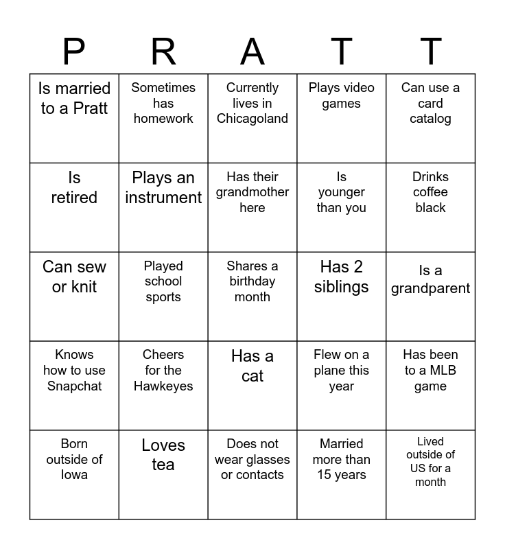 This bingo card has 29 words: Born outside of Iowa, Goes to a school building, Played school sports, Lived outside of US for a month, Is married to a Pratt, Currently lives in Chicagoland, Plays an instrument, Cheers for the Hawkeyes, Has 2 siblings, Loves tea, Is a grandparent, Shares a birthday month, Does not wear glasses or contacts, Married more than 15 years, Drinks coffee black, Swam/boated this summer, Has a cat, Knows how to use Snapchat, Can use a card catalog, Can sew or knit, Flew on a plane this year, Can drive a stick shift, Is younger than you, Is retired, Plays video games, Sometimes has homework, Has been to a MLB game, Has their grandmother here and Has hosted Thanksgiving.