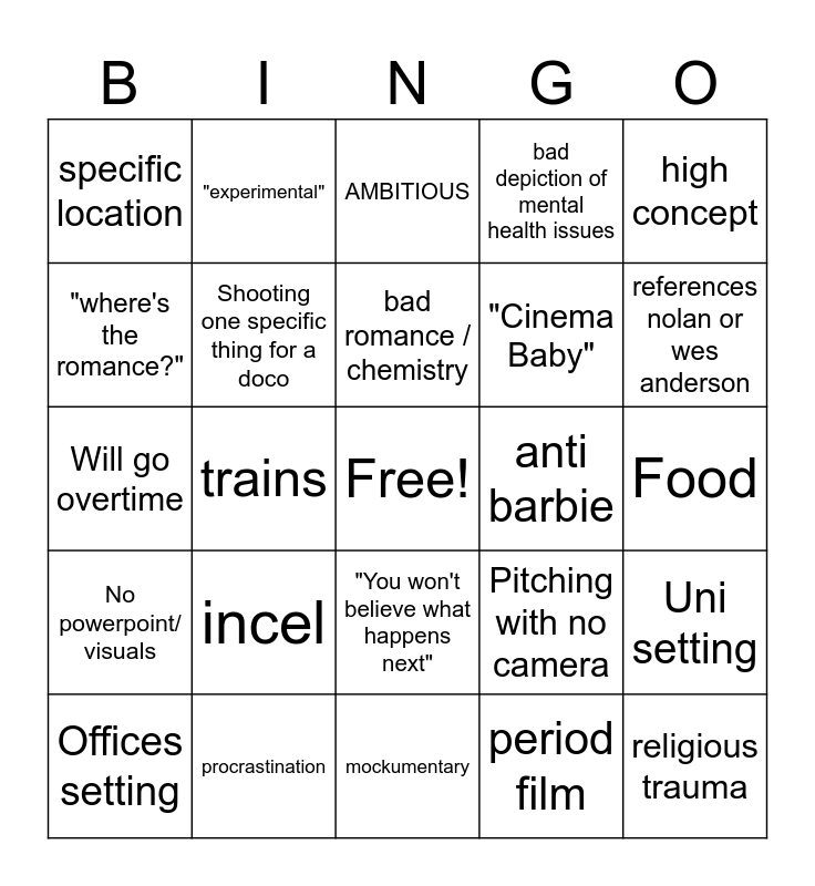 This bingo card has a free space and 36 words: SOmething something astrology, Capitalism, Lockdown, Shooting one specific thing for a doco, Pitching with no camera, No powerpoint/ visuals, bad romance / chemistry, music video, high concept, weapons, trains, bad depiction of mental health issues, queer, anti barbie, references nolan or wes anderson, specific location, spoof, incel, religious trauma, AMBITIOUS, Food, Uni setting, procrastination, Offices setting, mockumentary, "experimental", Will go overtime, Mention of Sam or Karen, "Cinema Baby", "where's the romance?", "I don't see it", "Iqbal reccomends day drinking", period film, "You won't believe what happens next", Strike reference and Needs specific cast.