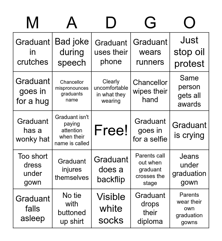 This bingo card has a free space and 28 words: Jeans under graduation gown, Can't walk in their shoes, Chancellor wipes their hand, Graduant drops their diploma, Graduant goes in for a hug, Graduant uses their phone, Bad joke during speech, Too short dress under gown, Graduant goes in for a selfie, Graduant falls asleep, Graduant has a wonky hat, Graduant wears runners, No tie with buttoned up shirt, Visible white socks, Same person gets all awards, 5 people with the same last name in a row, Graduant injures themselves, Chancellor mispronounces graduants name, Clearly uncomfortable in what they wearing, Graduant does a backflip, Graduant in crutches, Unengaging speech, Parents wear their own graduation gowns, Graduant isn't paying attention when their name is called, Graduant is crying, Parents call out when graduant crosses the stage, Just stop oil protest and Graduant waves to person in the audience.