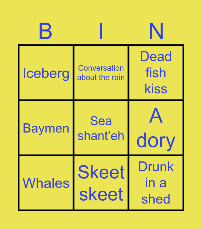 This bingo card has 10 words: Free!, Iceberg, Conversation about the rain, A dory, Baymen, Skeet skeet, Dead fish kiss, Whales, Sea shant’eh and Drunk in a shed.