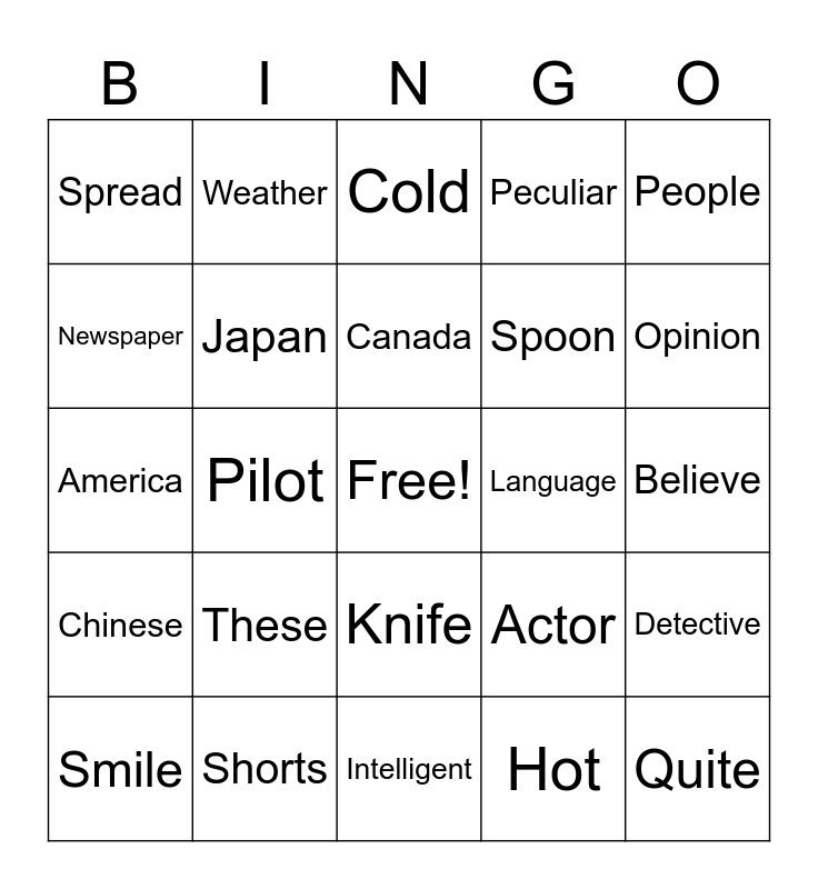 This bingo card has a free space and 80 words: Paint, Fever, Cold, Interesting, Scared, Math, Science, Geography, Dress, Deliver, School, Excited, Peculiar, Spread, Hack, Newspaper, Obituary, These, Favorite, Believe, Beautiful, People, America, Canada, Japan, Korea, Already, Enough, Setting, Plot, Opinion, Eyes, Intelligent, Question, Smile, Language, Taiwan, Group, Quiet, Quite, Protect, Laugh, Country, City, Wrong, Weather, Friend, Terrible, Fact, Conflict, Detective, Pilot, Actor, Firefighter, Police, Nurse, Doctor, Plumber, Thief, Knife, Spoon, Fork, Chopsticks, Notebook, Ballpen, Computer, Laptop, Picture, Phone, China, Chinese, Shorts, Shoes, Hair, Nose, Furniture, Hot, Patience, Important and Poker.