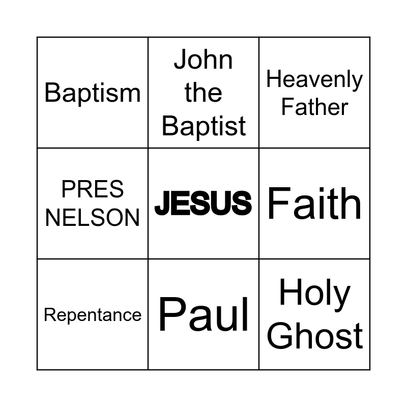 This bingo card has a free space and 8 words: Faith, Heavenly Father, John the Baptist, Repentance, Baptism, Holy Ghost, PRES NELSON and Paul.