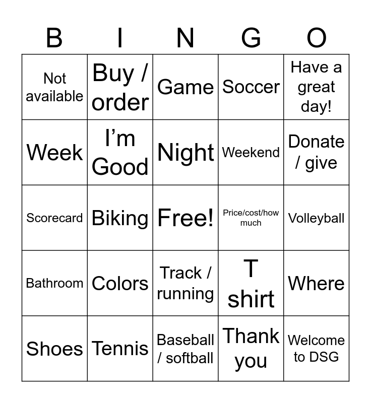 This bingo card has a free space and 44 words: Can I help you?, Welcome to DSG, What are you looking for?, Shoes, Sport, Thank you, Game, Golf, Have a great day!, Tennis, Soccer, Price/cost/how much, Track / running, Colors, Basketball, Baseball / softball, Football, Scorecard, Sports Matter, Donate / give, Buy / order, Online / internet, Sale / discount, Not available, Wrestling, Volleyball, I know a little sign, slow please, Hockey, T shirt, Bathroom, What, Where, Morning, Swimming, Biking, Noon, Afternoon, Evening, Night, Week, Weekend, How are you, I’m Good and How was your weekend.