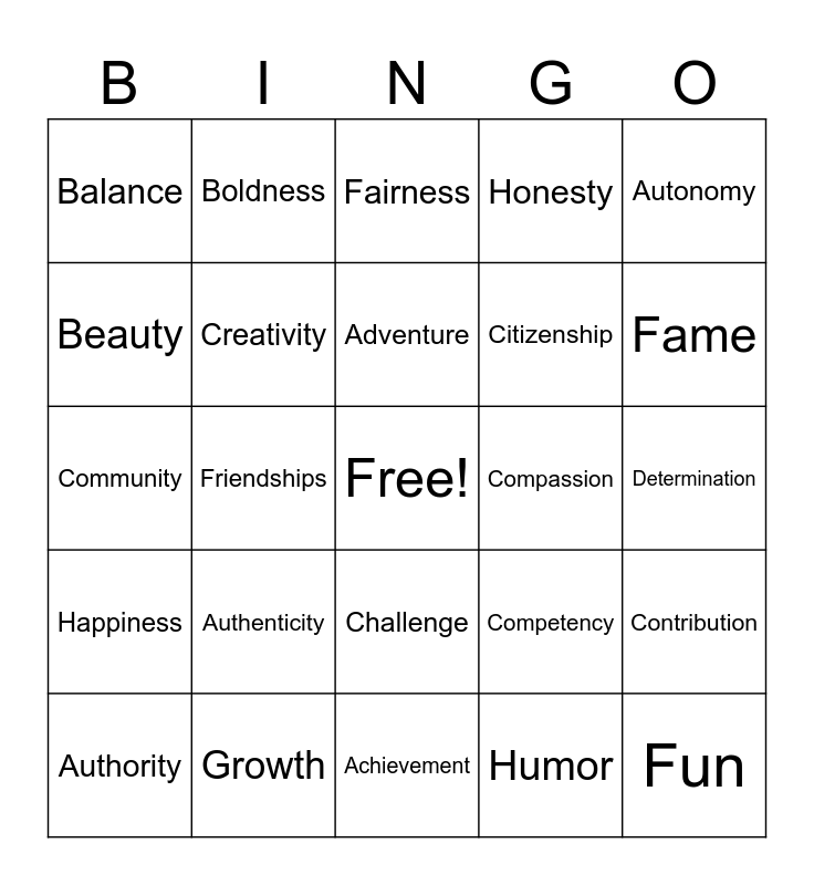 This bingo card has a free space and 25 words: Authenticity, Achievement, Adventure, Authority, Autonomy, Balance, Beauty, Boldness, Compassion, Challenge, Citizenship, Community, Competency, Contribution, Creativity, Curiosity, Determination, Fairness, Fame, Friendships, Fun, Growth, Happiness, Honesty and Humor.