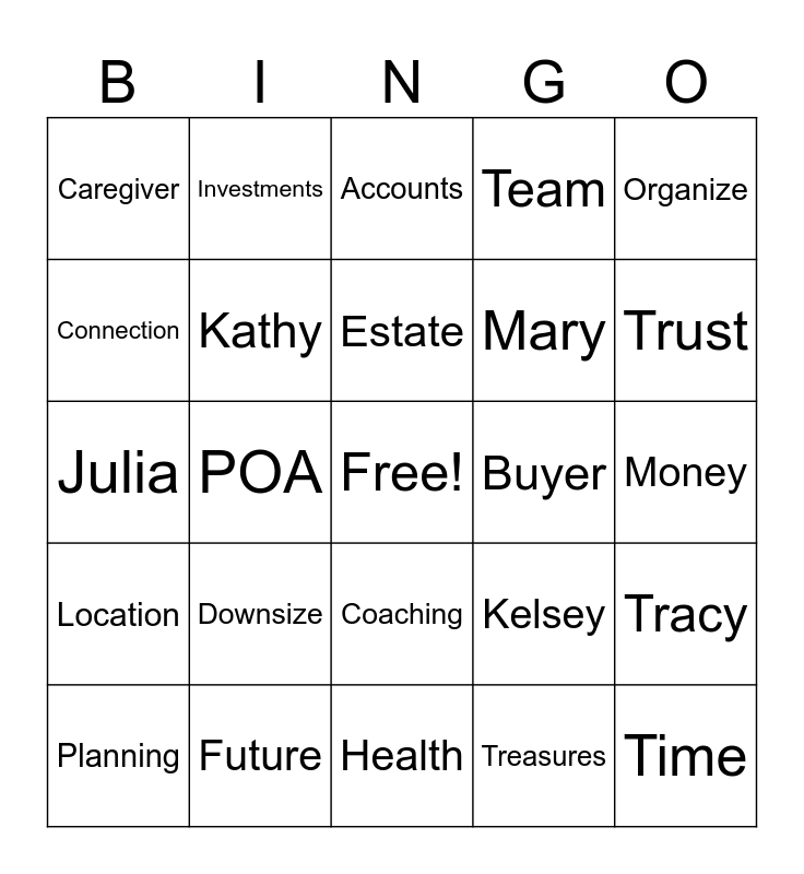 This bingo card has a free space and 25 words: Downsize, Health, Estate, Planning, Organize, Caregiver, Connection, Investments, Buyer, Coaching, Mary, Julia, Kelsey, Tracy, Kathy, House, Money, Accounts, Trust, POA, Time, Future, Location, Team and Treasures.