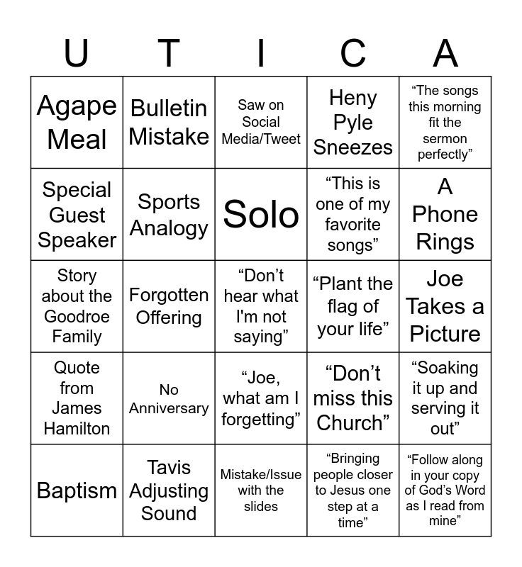 This bingo card has a free space and 27 words: “Don’t miss this Church”, “I’m not going to camp her very long”, “This is one of my favorite songs”, Mistake/Issue with the slides, Special Guest Speaker, Saw on Social Media/Tweet, Bulletin Mistake, Quote from James Hamilton, “Plant the flag of your life”, “Soaking it up and serving it out”, Story about the Goodroe Family, Heny Pyle Sneezes, Baptism, Tavis Adjusting Sound, A Phone Rings, Choir Special, Sports Analogy, Solo, No Anniversary, Agape Meal, Joe Takes a Picture, “Bringing people closer to Jesus one step at a time”, Forgotten Offering, “Follow along in your copy of God’s Word as I read from mine”, “Joe, what am I forgetting”, “The songs this morning fit the sermon perfectly” and Reference to Bingo.