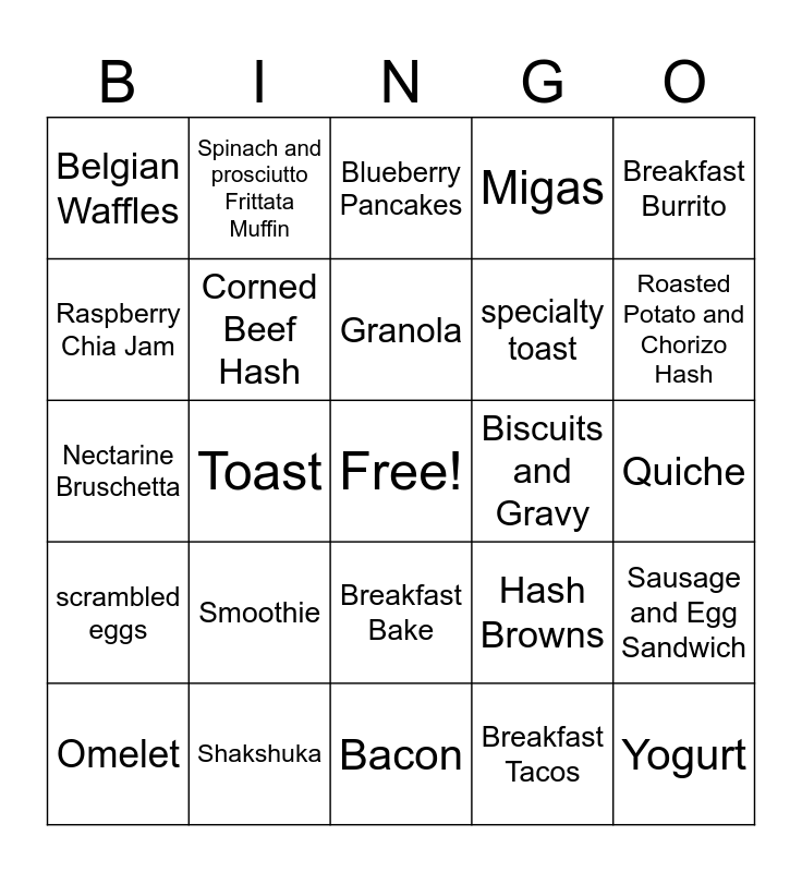 This bingo card has a free space and 31 words: Bacon, Eggs, Toast, French Toast, Belgian Waffles, Blueberry Pancakes, Corned Beef Hash, Hash Browns, Biscuits and Gravy, Breakfast Tacos, Quiche, Yogurt, Acai Bowl, Oatmeal, Roasted Potato and Chorizo Hash, Lemon- Almond Poppy Seed Muffin, Sausage and Egg Sandwich, Smoothie, scrambled eggs, Breakfast Bake, Breakfast Burrito, Avocado Toast, Omelet, Spinach and prosciutto Frittata Muffin, specialty toast, Raspberry Chia Jam, Migas, Nectarine Bruschetta, Shakshuka, Granola and Fruit bowl.
