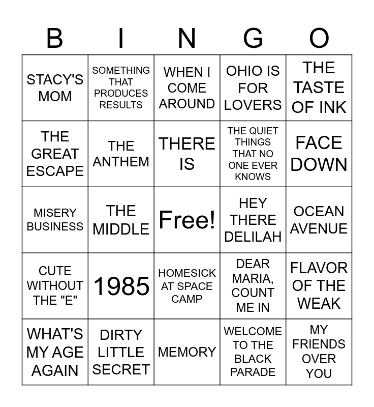 This bingo card has a free space and 29 words: WHAT'S MY AGE AGAIN, MISS MURDER, THE MIDDLE, IN TOO DEEP, STACY'S MOM, WHEN I COME AROUND, THE ANTHEM, 1985, HEY THERE DELILAH, DIRTY LITTLE SECRET, OCEAN AVENUE, MY FRIENDS OVER YOU, MEMORY, WELCOME TO THE BLACK PARADE, FACE DOWN, WHY DON'T YOU GET A JOB, HOMESICK AT SPACE CAMP, CUTE WITHOUT THE "E", THE TASTE OF INK, MISERY BUSINESS, DEAR MARIA, COUNT ME IN, JUST ENOUGH TO LOVE YOU, THE QUIET THINGS THAT NO ONE EVER KNOWS, THE GREAT ESCAPE, OHIO IS FOR LOVERS, SOMETHING THAT PRODUCES RESULTS, FLAVOR OF THE WEAK, THERE IS and WHEN YOU'RE AROUND.