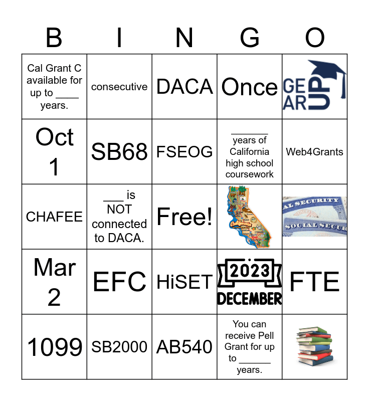 This bingo card has 5 images, a free space and 19 words: EFC, SB2000, FSEOG, 1099, Cal Grant C available for up to ____ years., Oct 1, consecutive, HiSET, _______ years of California high school coursework, CHAFEE, FTE, SB68, You can receive Pell Grant for up to ______ years., DACA, Web4Grants, ___ is NOT connected to DACA., Mar 2, Once and AB540.
