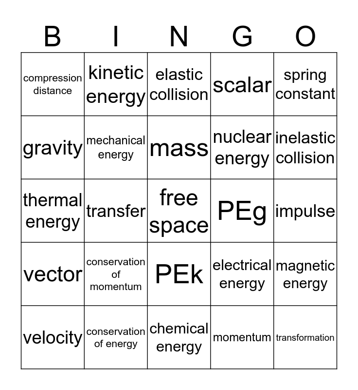 This bingo card has a free space and 24 words: conservation of momentum, conservation of energy, mass, velocity, spring constant, compression distance, gravity, kinetic energy, PEg, PEk, nuclear energy, thermal energy, electrical energy, magnetic energy, mechanical energy, momentum, impulse, elastic collision, inelastic collision, transfer, transformation, vector, scalar and chemical energy.