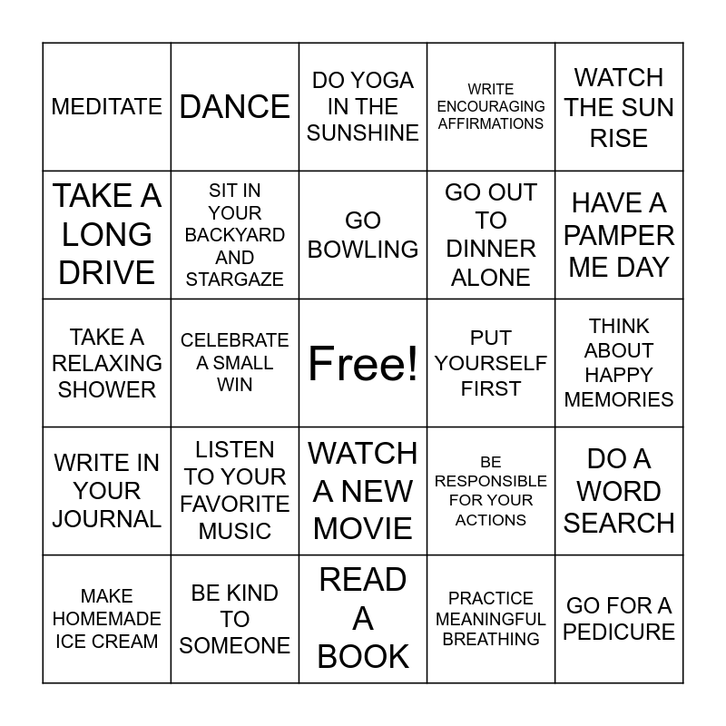 This bingo card has a free space and 83 words: SIT QUIETLY, WRITE OUT BUCKET LIST, DO YOGA IN THE SUNSHINE, UNPLUG FROM TECHNOLOGY, READ A BOOK, TAKE A BUBBLE BATH, MAKE A SUMMER PLAYLIST, GO OUT FOR ICE CREAM, GO FOR A LONG WALK OR RUN, VISIT YOUR FAVORITE STORE, HAVE A PICNIC, BINGE WATCH YOUR FAVOIRTE SERIES, SIT IN YOUR BACKYARD AND STARGAZE, PUT YOURSELF FIRST, TAKE A DAY TIME NAP, MEDITATE, MAKE HOMEMADE ICE CREAM, TAKE A LONG DRIVE, START A NEW HOBBY, SAY YES TO SOMETHING NEW, GO FOR A MANICURE, GO OUT TO DINNER ALONE, GO FOR A PEDICURE, HAD A BRUNCH DATE, CELEBRATE A SMALL WIN, REPEAT DAILY AFFIRMATION, CALL YOUR BEST FRIEND TO TALK, BUY YOURSELF A CUPCAKE, TAKE A RELAXING BATH, DRINK 8 GLASSES OF WATER, LISTEN TO YOUR FAVORITE MUSIC, DECLUTTER YOUR BEDROOM, WRITE 3 THINGS YOU’RE GRATEFUL FOR, TAKE A RELAXING SHOWER, MORNING EXERCISE, SET YOUR GOALS, READ A BOOK, GET AT LEAST 8 HOURS OF SLEEP, HAVE A PAMPER ME DAY, WRITE IN YOUR JOURNAL, DIGITAL DETOX DAY, LIGHT YOUR FAVORITE SCENTED CANDLE, TREAT YOURSELF, TAKE A POWER NAP, ANSWER SELF CARE PROMPTS, SAY YES TO YOURSELF, DANCE, ALLOW YOURSELF TO MAKE MISTAKES, READ/WRITE POETRY, LET YOURSELF CRY, BE RESPONSIBLE FOR YOUR ACTIONS, WRITE ENCOURAGING AFFIRMATIONS, THINK ABOUT HAPPY MEMORIES, READ A NEW BOOK, PAINT YOUR NAILS, ACCOMPLISH A GOAL, TAKE A BREAK FROM SOCIAL MEDIA, PLAN A SOLO TRIP, BE KIND TO SOMEONE, EAT A HEALTHY MEAL, HAVE A DANCE PARTY, WORK IN A GARDEN, PLAN A FUN DAY, WATCH THE SUN RISE, HAVE A CUP OF TEA/COFFEE, DO A WORD SEARCH, DO SOMETHING SCARY, COLOR A PICTURE, GO TO BED EARLY, HAVE A PHONE FREE DAY, JOIN A CLUB, MAKE ART OR DO A CRAFT, LISTEN TO YOUR FAVORITE BAND, WATCH A NEW MOVIE, PRACTICE MEANINGFUL BREATHING, TAKE A FUN PHOTO, PLAY A GAME, GO BOWLING, GO FISHING, GET A MASSAGE, GO TO THE BEACH, TRY A NEW HOBBY and DRINK A FULL GLASS OF WATER.