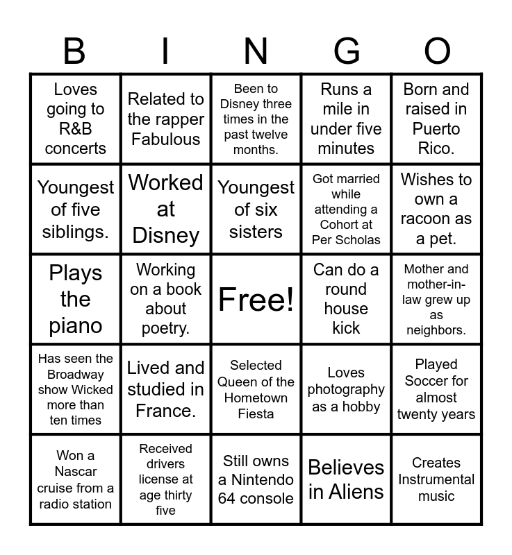This bingo card has a free space and 24 words: Won a Nascar cruise from a radio station, Lived and studied in France., Youngest of six sisters, Believes in Aliens, Born and raised in Puerto Rico., Loves going to R&B concerts, Related to the rapper Fabulous, Been to Disney three times in the past twelve months., Can do a round house kick, Mother and mother-in-law grew up as neighbors., Plays the piano, Worked at Disney, Loves photography as a hobby, Played Soccer for almost twenty years, Youngest of five siblings., Received drivers license at age thirty five, Still owns a Nintendo 64 console, Runs a mile in under five minutes, Wishes to own a racoon as a pet., Has seen the Broadway show Wicked more than ten times, Working on a book about poetry., Selected Queen of the Hometown Fiesta, Got married while attending a Cohort at Per Scholas and Creates Instrumental music.