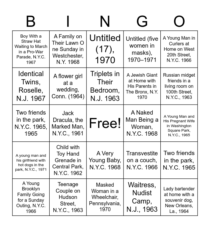 This bingo card has a free space and 24 words: Child with Toy Hand Grenade in Central Park, N.Y.C. 1962, Teenage Couple on Hudson Street, N.Y.C., 1963, Triplets in Their Bedroom, N.J. 1963, A Young Brooklyn Family Going for a Sunday Outing, N.Y.C. 1966, A Young Man in Curlers at Home on West 20th Street, N.Y.C. 1966, Boy With a Straw Hat Waiting to March in a Pro-War Parade, N.Y.C. 1967, Identical Twins, Roselle, N.J. 1967, A Family on Their Lawn One Sunday in Westchester, N.Y. 1968, A Naked Man Being a Woman, N.Y.C. 1968, A Very Young Baby, N.Y.C. 1968, A Jewish Giant at Home with His Parents in The Bronx, N.Y. 1970, Two friends in the park, N.Y.C. 1965, 1965, Transvestite on a couch, N.Y.C. 1966, Two friends in the park, N.Y.C. 1965, A flower girl at a wedding, Conn. (1964), Waitress, Nudist Camp, N.J., 1963, A Young Man and His Pregnant Wife in Washington Square Park, N.Y.C., 1965, Untitled (17), 1970, Russian midget friends in a living room on 100th Street, N.Y.C., 1963, Jack Dracula, the Marked Man, N.Y.C., 1961, Lady bartender at home with a souvenir dog, New Orleans, La., 1964, A young man and his girlfriend with hot dogs in the park, N.Y.C., 1971, Untitled (five women in masks), 1970–1971 and Masked Woman in a Wheelchair, Pennsylvania, 1970.