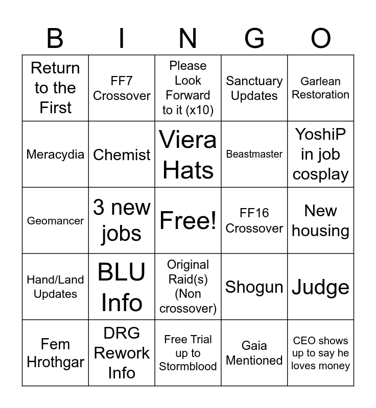This bingo card has a free space and 24 words: BLU Info, DRG Rework Info, Viera Hats, Fem Hrothgar, Garlean Restoration, Return to the First, Meracydia, FF7 Crossover, FF16 Crossover, Original Raid(s) (Non crossover), Beastmaster, Geomancer, Shogun, Judge, Chemist, Gaia Mentioned, New housing, Please Look Forward to it (x10), YoshiP in job cosplay, 3 new jobs, CEO shows up to say he loves money, Hand/Land Updates, Sanctuary Updates and Free Trial up to Stormblood.