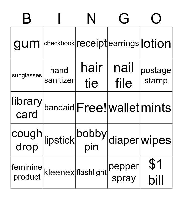 This bingo card has a free space and 24 words: lipstick, kleenex, hair tie, feminine product, lotion, gum, sunglasses, checkbook, wallet, bobby pin, nail file, library card, diaper, wipes, hand sanitizer, pepper spray, mints, receipt, postage stamp, bandaid, $1 bill, cough drop, earrings and flashlight.