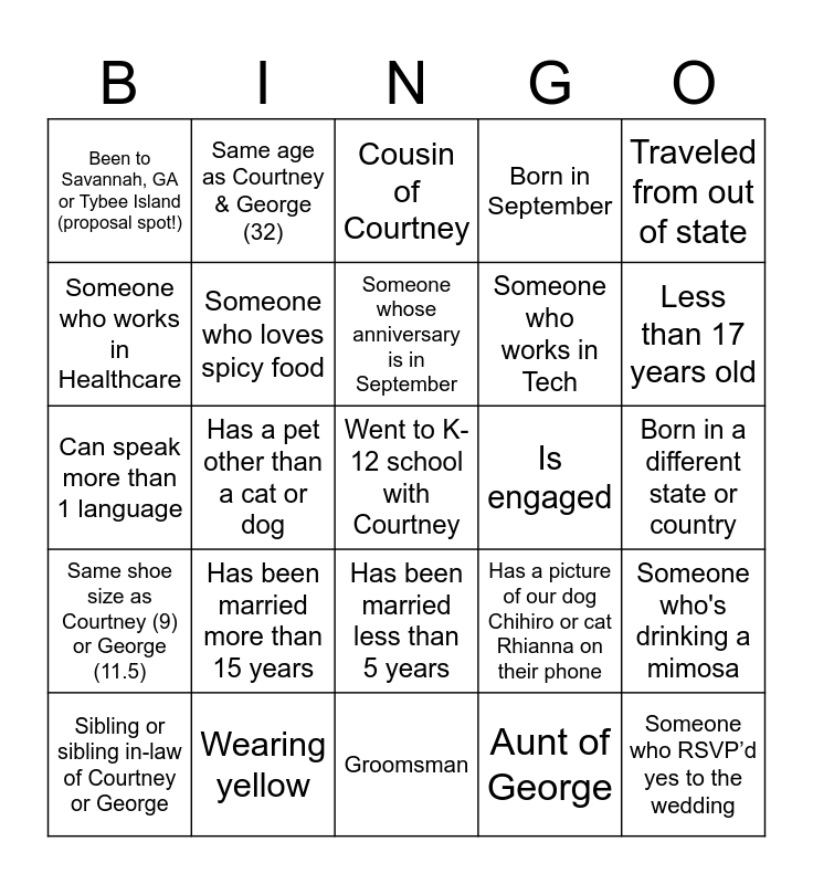 This bingo card has 43 words: Free!, Went to K-12 school with Courtney, Went to same college as George (U of M), Sibling or sibling in-law of Courtney or George, Aunt of Courtney, Aunt of George, Cousin of Courtney, Cousin of George, Traveled from out of state, Wearing yellow, Born in September, Is engaged, Has been married less than 5 years, Has been married more than 15 years, Bridesmaid, Groomsman, Drives a Jeep or Bronco, Can speak more than 1 language, Has been to Wyoming, Less than 17 years old, Same age as Courtney & George (32), Shares your birth month, Has less than 5 letters in their name, Been to Savannah, GA or Tybee Island (proposal spot!), Been to the Masonic Temple in Detroit, Born in a different state or country, Shares the same hobby as you, Been to a concert with George or Courtney, Has a picture of our dog Chihiro or cat Rhianna on their phone, Same shoe size as Courtney (9) or George (11.5), Has a tattoo, Someone who's drinking a mimosa, Someone who does not have a Facebook, Has a pet other than a cat or dog, Plays a musical instrument, Someone who met their significant other online, Someone who RSVP’d yes to the wedding, Someone whose anniversary is in September, Someone who works in Healthcare, Someone who works in Tech, Someone who hates onions, Someone who loves spicy food and Been to Greece or Italy (honeymoon destinations!).