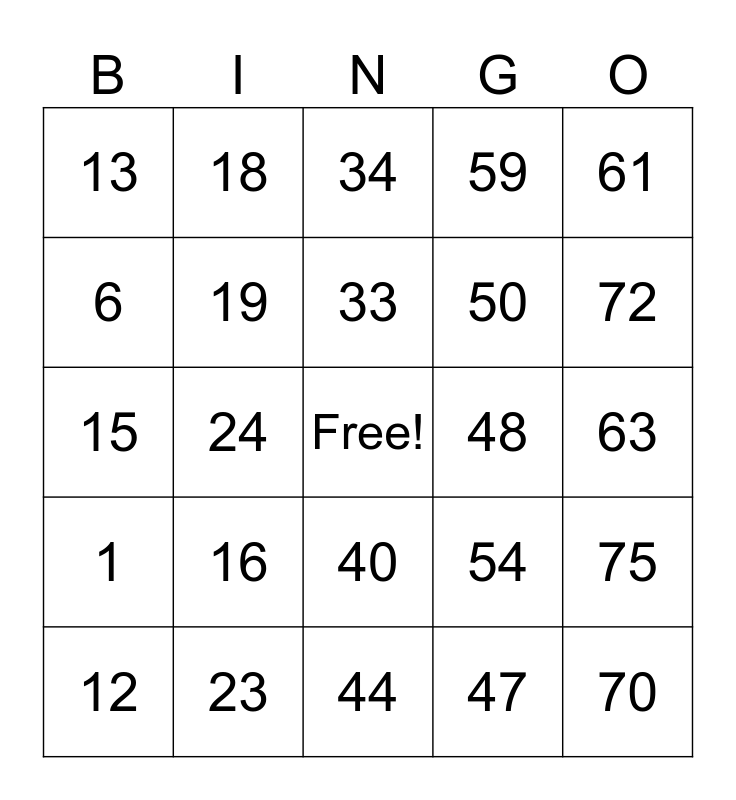 This bingo card has a free space and 24 words: 12, 16, 33, 47, 61, 13, 18, 34, 48, 63, 15, 19, 54, 75, 6, 23, 44, 59, 72, 1, 24, 40, 50 and 70.