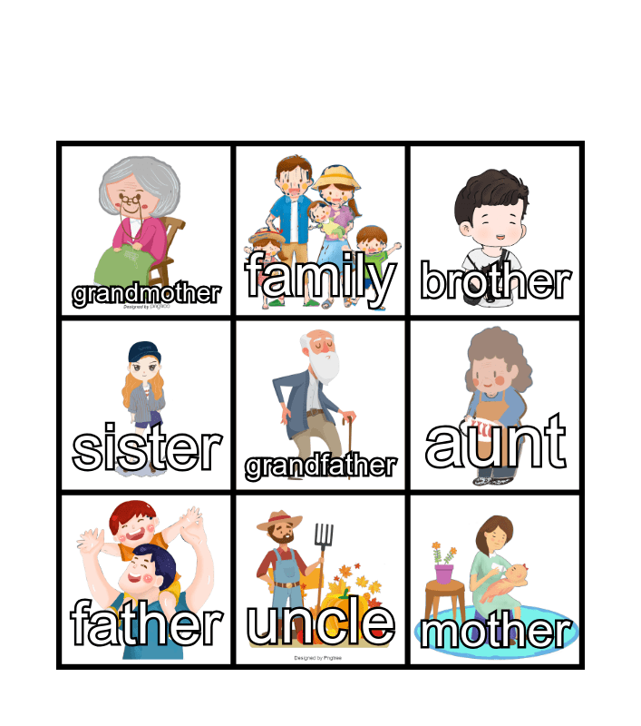 This bingo card has 8 images, a free space and 8 words: aunt, brother, family, father, grandmother, mother, sister and uncle.