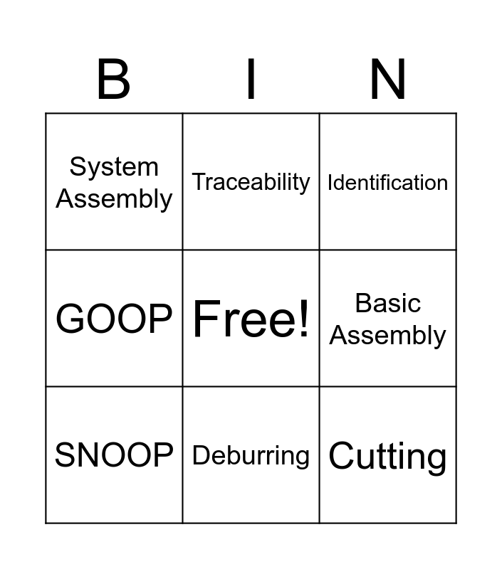 This bingo card has a free space and 9 words: SNOOP, Identification, Traceability, GOOP, System Assembly, Basic Assembly, Cutting, Laser Marking and Deburring.
