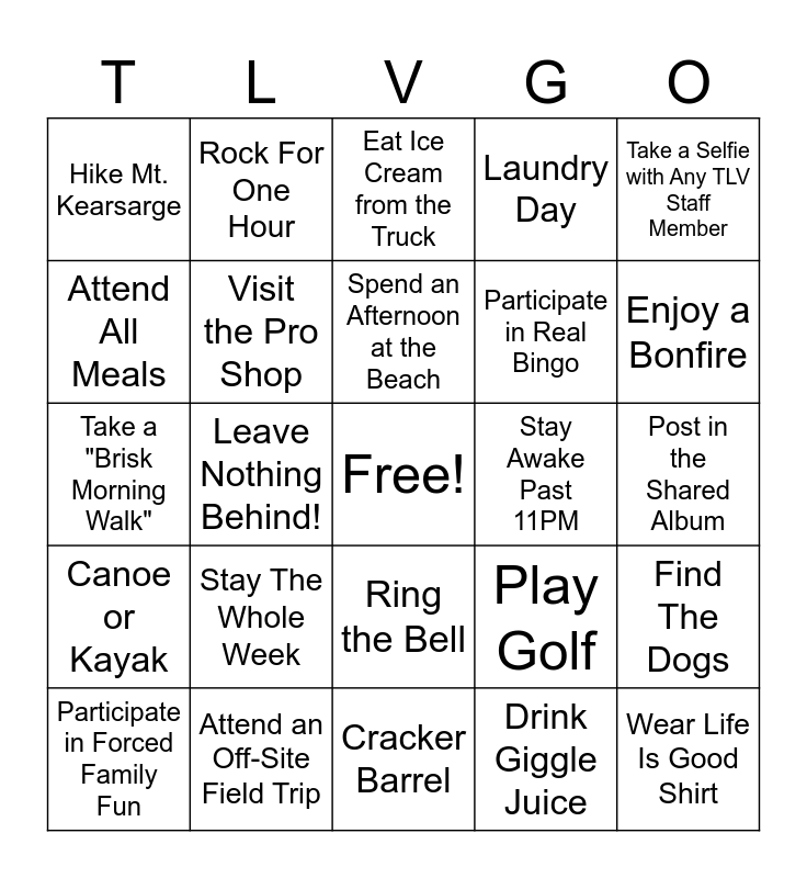 This bingo card has a free space and 24 words: Stay The Whole Week, Attend an Off-Site Field Trip, Spend an Afternoon at the Beach, Participate in Forced Family Fun, Take a Selfie with Any TLV Staff Member, Hike Mt. Kearsarge, Attend All Meals, Rock For One Hour, Stay Awake Past 11PM, Ring the Bell, Participate in Real Bingo, Take a "Brisk Morning Walk", Play Golf, Find The Dogs, Visit the Pro Shop, Drink Giggle Juice, Post in the Shared Album, Eat Ice Cream from the Truck, Enjoy a Bonfire, Leave Nothing Behind!, Wear Life Is Good Shirt, Canoe or Kayak, Laundry Day and Cracker Barrel.