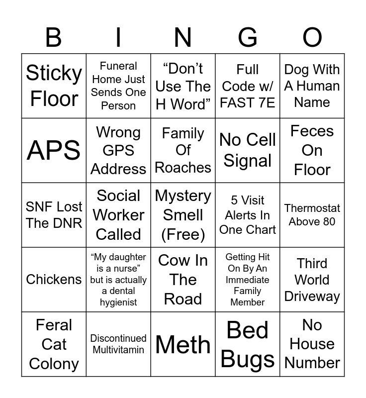 This bingo card has a free space and 24 words: “My daughter is a nurse” but is actually a dental hygienist, Discontinued Multivitamin, Family Of Roaches, Feral Cat Colony, Dog With A Human Name, Sticky Floor, APS, Funeral Home Just Sends One Person, 5 Visit Alerts In One Chart, Cow In The Road, No Cell Signal, SNF Lost The DNR, Getting Hit On By An Immediate Family Member, Third World Driveway, Wrong GPS Address, Bed Bugs, Thermostat Above 80, “Don’t Use The H Word”, Feces On Floor, Social Worker Called, No House Number, Chickens, Full Code w/ FAST 7E and Meth.