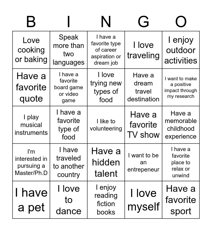 This bingo card has 25 words: I have traveled to another country, I enjoy reading fiction books, I love trying new types of food, I have a pet, I enjoy outdoor activities, Love cooking or baking, Have a favorite quote, Speak more than two languages, Have a favorite TV show, Have a hidden talent, Have a dream travel destination, I play musical instruments, I want to be an entrepeneur, I have a favorite place to relax or unwind, I have a favorite board game or video game, Have a favorite sport, Have a memorable childhood experience, I have a favorite type of career aspiration or dream job, I want to make a positive impact through my research, I have a favorite type of food, I like to volunteering, I love to dance, I'm interested in pursuing a Master/Ph.D, I love traveling and I love myself.