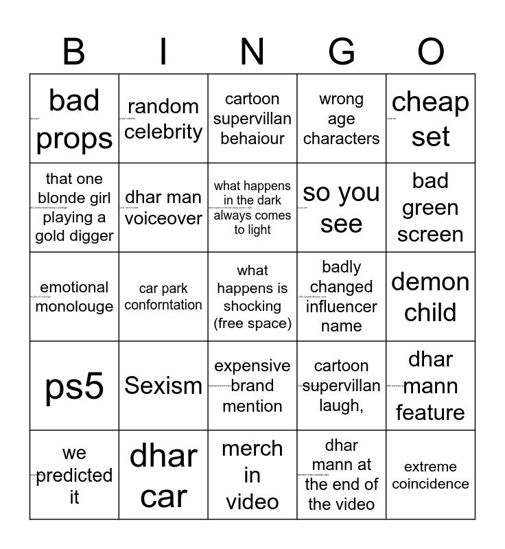 This bingo card has 14 images, a free space and 24 words: Sexism, dhar car, what happens in the dark always comes to light, we predicted it, cheap set, bad props, that one blonde girl playing a gold digger, random celebrity, badly changed influencer name, expensive brand mention, so you see, emotional monolouge, cartoon supervillan laugh,, dhar mann feature, dhar man voiceover, dhar mann at the end of the video, demon child, cartoon supervillan behaiour, bad green screen, car park conforntation, extreme coincidence, ps5, wrong age characters and merch in video.