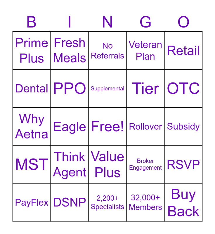 This bingo card has a free space and 38 words: Travel Advantage, Enhancement, National Network, PPO, RSVP, Think Agent, Supplemental, Gateway, Retail, Tier, Eagle, Veteran Plan, Buy Back, Subsidy, Dental, MST, Value Plus, No Referrals, Fitness DMR, Rollover, Prime Plus, DSNP, OTC, PayFlex, Nations Benefits, 2,200+ Specialists, Golf, Member Experience, Shoes, Mail Order, 4 Pillars, Value Plus, 32,000+ Members, Fresh Meals, Broker Focused, Broker Engagement, Why Aetna and First Looks.