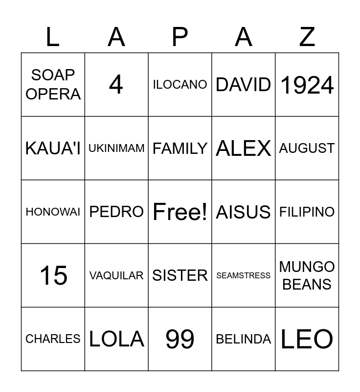 This bingo card has a free space and 24 words: VAQUILAR, LOLA, FAMILY, CHARLES, 1924, SOAP OPERA, KAUA'I, 4, AISUS, SISTER, ALEX, HONOWAI, SEAMSTRESS, MUNGO BEANS, UKINIMAM, BELINDA, FILIPINO, ILOCANO, AUGUST, PEDRO, LEO, 15, DAVID and 99.