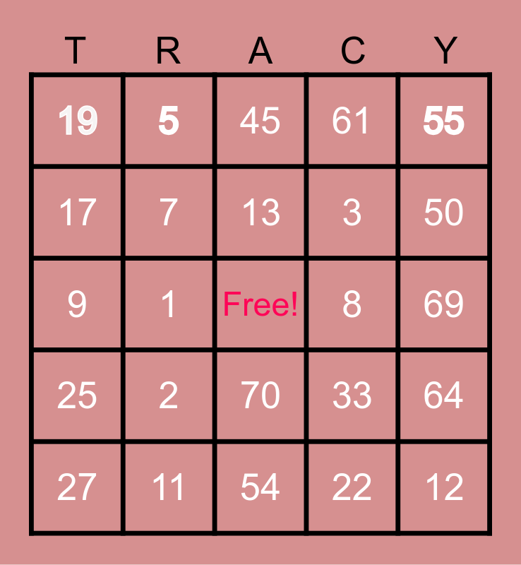 This bingo card has a free space and 24 words: 2, 11, 13, 27, 55, 19, 17, 5, 8, 70, 3, 9, 33, 64, 7, 22, 69, 45, 50, 1, 12, 25, 61 and 54.