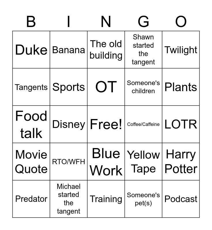 This bingo card has a free space and 24 words: RTO/WFH, Michael started the tangent, OT, Predator, Twilight, Duke, Tangents, Banana, Coffee/Caffeine, Blue Work, Someone's children, Food talk, Yellow Tape, Harry Potter, Sports, Someone's pet(s), LOTR, The old building, Plants, Disney, Podcast, Movie Quote, Shawn started the tangent and Training.