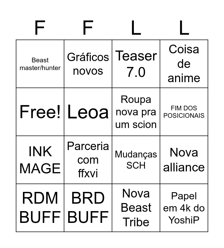 This bingo card has 16 words: BRD BUFF, Nova alliance, Teaser 7.0, Beast master/hunter, INK MAGE, Gráficos novos, Mudanças SCH, Nova Beast Tribe, Free!, Leoa, RDM BUFF, Coisa de anime, Parceria com ffxvi, FIM DOS POSICIONAIS, Roupa nova pra um scion and Papel em 4k do YoshiP.