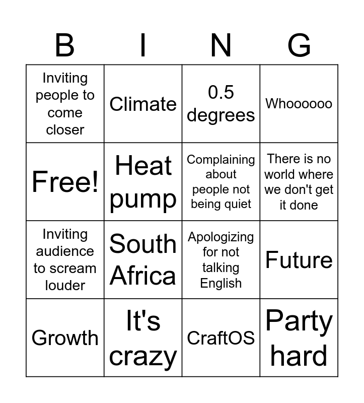 This bingo card has 16 words: It's crazy, Future, 0.5 degrees, Inviting people to come closer, Inviting audience to scream louder, Climate, Apologizing for not talking English, CraftOS, Free!, Heat pump, Growth, Whoooooo, South Africa, There is no world where we don't get it done, Complaining about people not being quiet and Party hard.