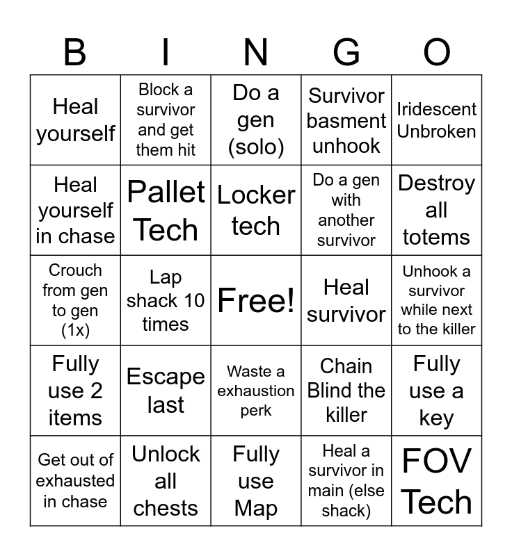 This bingo card has a free space and 85 words: Boop the killer, Boop Crow, Do a gen (solo), CJ Tech, Window Tech, Bush Tech, Tree Tech, Reset Pallet, Heal all survivors once, Unhook all survivors once, Jumpscare killer, Long flashlight stun, Pallet Tech, Heal survivor, Use exhaustion perk twice in chase, Heal yourself, Get out of exhausted in chase, Heal yourself in chase, Get 3 Great Skill checks on the same gen, Avoid killers attack 3 times, Fail 3 skill checks in a row, Do a gen with another survivor, FOV Tech, Escape with hatch, Lap shack 10 times, Vault in same chase 3 times, Stay in killer radius for 30 seconds without getting caught, Lap killer on same pallet 5 times, Fall 4 times in same chase, Heal downed survivor, Escape last, Lap around the map, Loop killer for 60 seconds, Crouch from gen to gen (1x), Fully use Flashlight, Fully use Toolbox, Fully use Map, Kobe, Fully use 2 items, Destroy all totems, Take 2 Protection Hits, Fully use Medkit, Heal survivor in chase, Get all Max Emblems, Get highest score, 99 Gen, Open exit gate, Finish a Challenge, Get AFK Crow, T-Bag killer, Block a survivor and get them hit, Locker tech, Pallet save, Flashlight save, Survivor wiggles off Killer, Cleanse hex (Free if not possible), Unlock all chests, Survivor basment unhook, Fast vault into locker 3 times, Waste a pallet, 360 killer, Moonwalk, Wiggle off killer, Iridescent Evader, Iridescent Benevolent, Iridescent Unbroken, Iridescent Lightbringer, Fully use a key, Sabo a hook, Get healed from downed collapse, First to get chased, First to finish a gen, First to get hooked, Repair a gen with an interactable (Free if not possible), Let the killer hit you, Waste a exhaustion perk, Heal a survivor in main (else shack), Finish the last gen, Unhook during end game, Escape with killer specific item (Free if not possible), Unhook a survivor while next to the killer, Max out score in 1 catagory, Get 2 pips, Chain Blind the killer and Complete Daily Challenge.