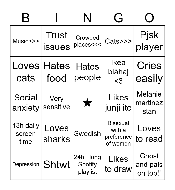 This bingo card has a free space and 24 words: Loves sharks, Shtwt, Hates people, Depression, Pjsk player, Music>>>, Loves cats, Trust issues, Likes junji ito, Swedish, Ikea blåhaj <3, Social anxiety, Bisexual with a preference of women, Loves to read, Hates food, Likes to draw, Melanie martinez stan, Crowded places<<<, Cries easily, Very sensitive, Ghost and pals on top!!, 13h daily screen time, Cats>>> and 24h+ long Spotify playlist.