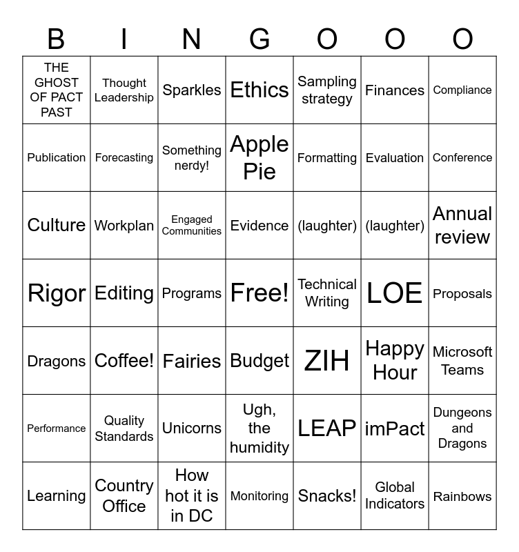 This bingo card has a free space and 48 words: LEAP, Evaluation, Monitoring, Editing, Engaged Communities, Proposals, Thought Leadership, Country Office, Finances, Budget, Compliance, Ethics, (laughter), (laughter), Performance, LOE, Publication, Conference, imPact, Sampling strategy, Formatting, Programs, THE GHOST OF PACT PAST, Forecasting, Dungeons and Dragons, Something nerdy!, Annual review, Learning, Evidence, Workplan, Global Indicators, Technical Writing, Microsoft Teams, Quality Standards, Rigor, ZIH, Happy Hour, Culture, Fairies, Unicorns, Dragons, Rainbows, Sparkles, How hot it is in DC, Apple Pie, Ugh, the humidity, Coffee! and Snacks!.