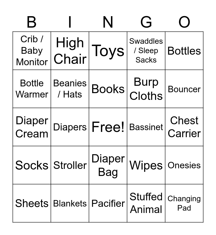 This bingo card has a free space and 24 words: Stroller, Blankets, Books, Sheets, Bottles, Crib / Baby Monitor, Bottle Warmer, High Chair, Bassinet, Diaper Bag, Burp Cloths, Diaper Cream, Wipes, Onesies, Beanies / Hats, Stuffed Animal, Chest Carrier, Toys, Bouncer, Diapers, Changing Pad, Socks, Swaddles / Sleep Sacks and Pacifier.
