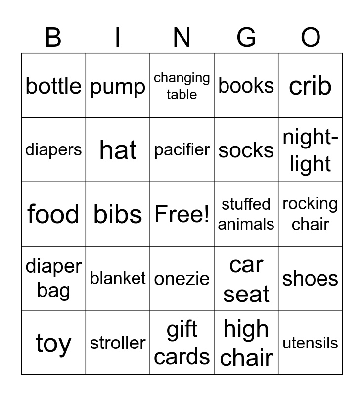This bingo card has a free space and 24 words: blanket, stroller, pacifier, toy, crib, bottle, diapers, pump, stuffed animals, onezie, socks, food, car seat, shoes, hat, high chair, rocking chair, changing table, night-light, bibs, utensils, diaper bag, books and gift cards.